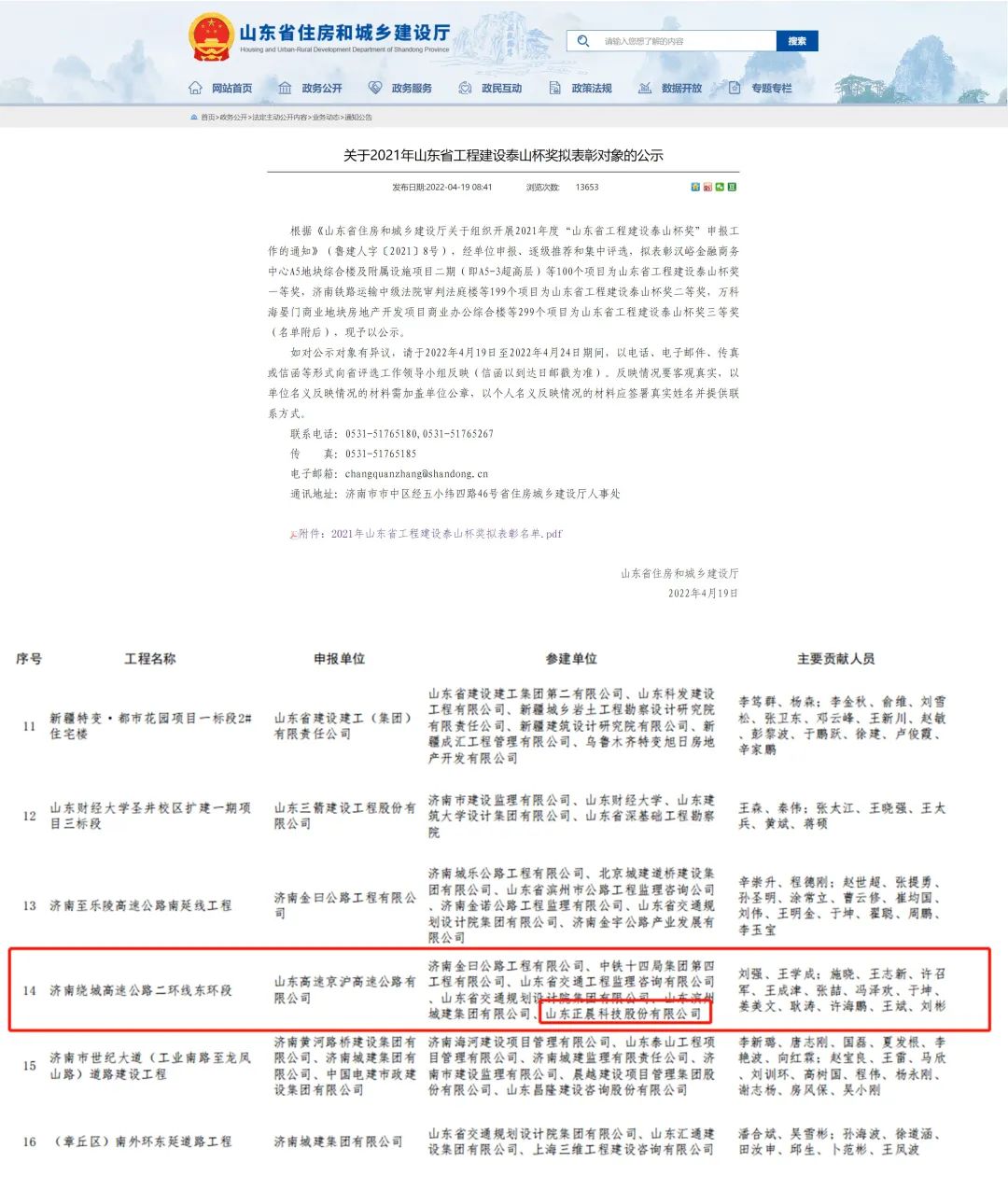 近日,半岛电竞(中国)半岛有限公司官网参建的“济南绕城高速公路二环线东环段项目”荣获2021年度山东省工程建设泰山杯奖!